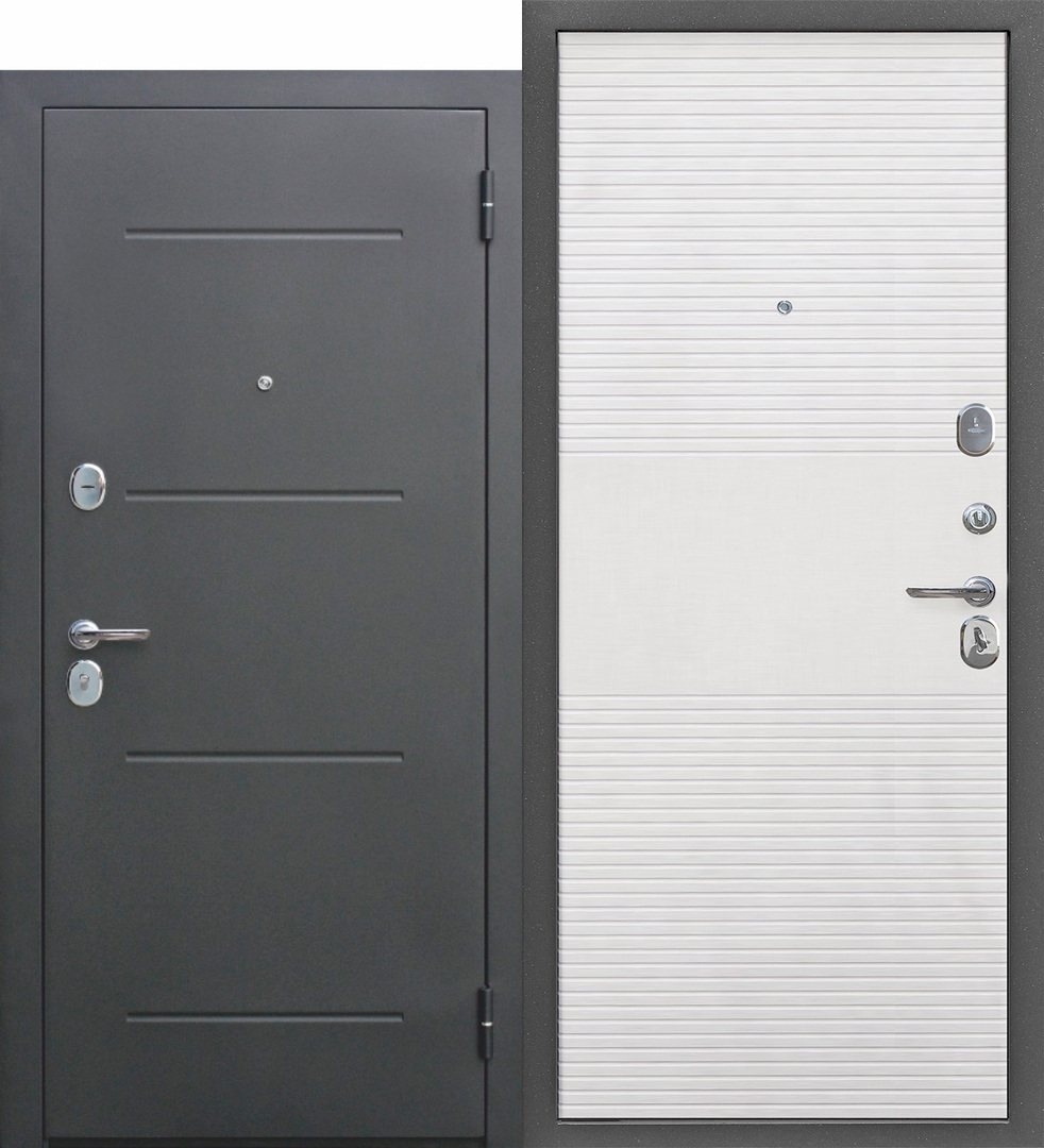 | Фурнитура | Ручка раздельная — сатин хром, глазок широкого обзора — сатин хром, петли — 2 шт., накладки овальные — сатин хром, ночная задвижка, противосъемные штыри — 2 шт. | |