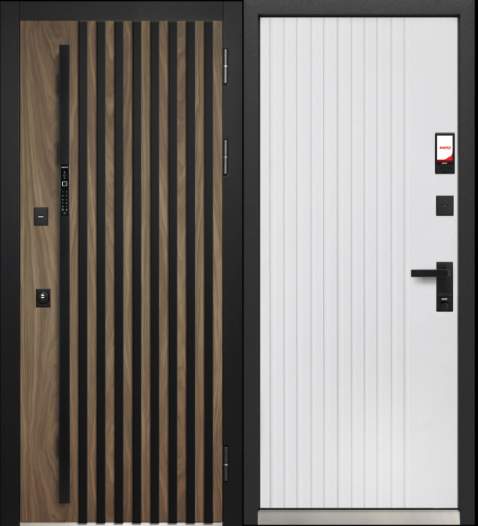 Ручка штанга с функцией видео-домофона, глазок широкого обзора — черный, петли — 3 шт., накладки с защитой от сквозняков — черный, ночная задвижка, противосъемные штыри — 2 шт. |