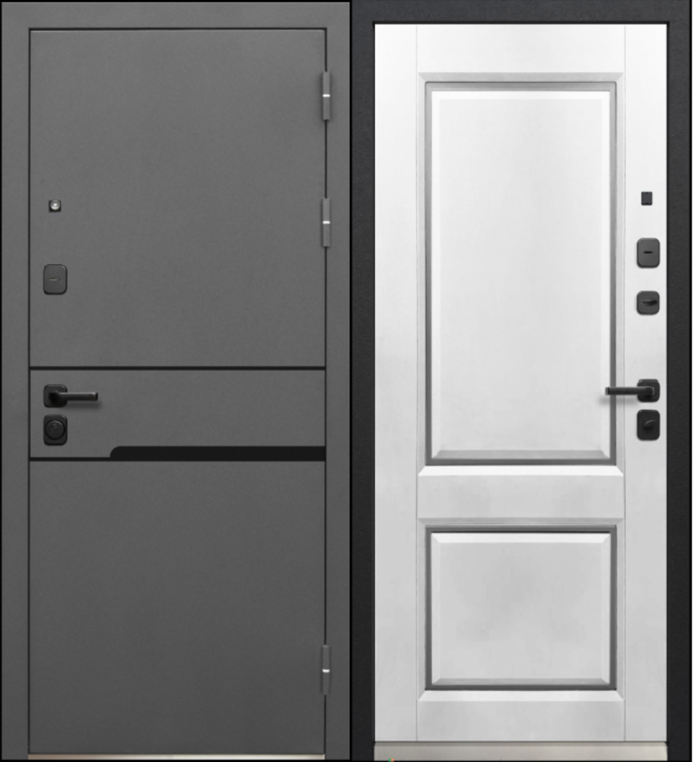 Ручка раздельная — черный, глазок широкого обзора — черный, петли — 3 шт., накладки с защитой от сквозняков — черный, ночная задвижка, противосъемные штыри — 2 шт.