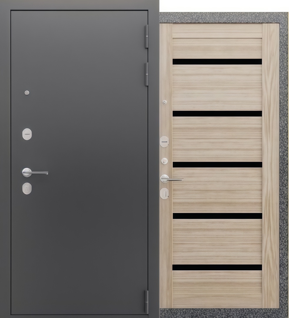 | Фурнитура | Ручка раздельная — хром, глазок широкого обзора — хром, петли — 2 шт., накладки овальные — хром, ночная задвижка, противосъемные штыри — 2 шт. |